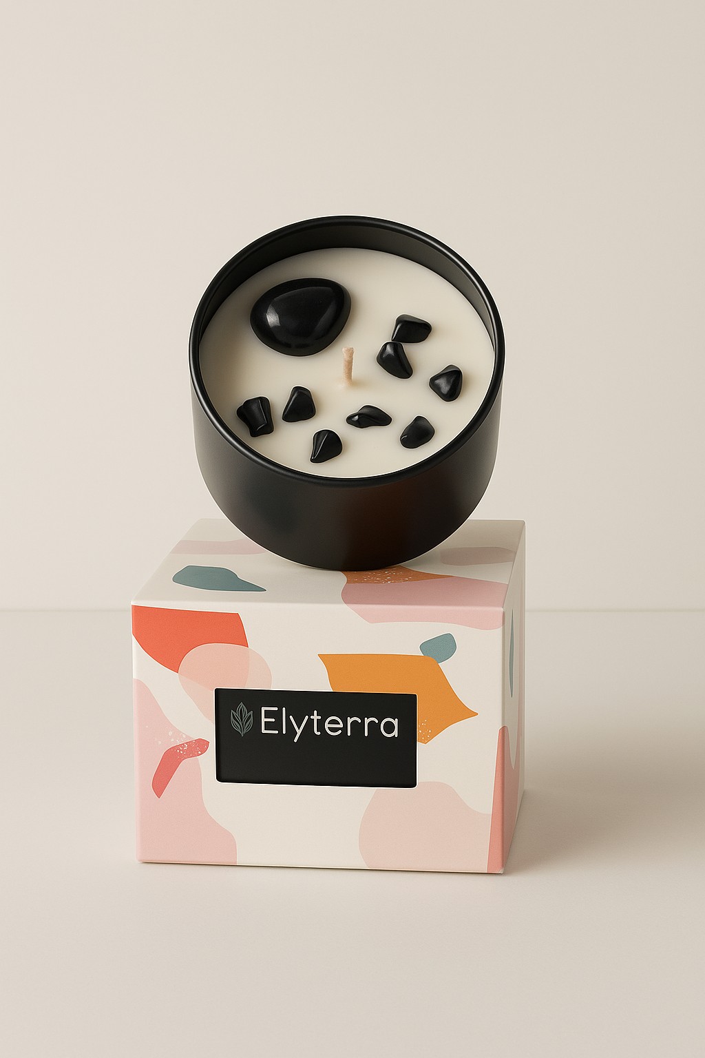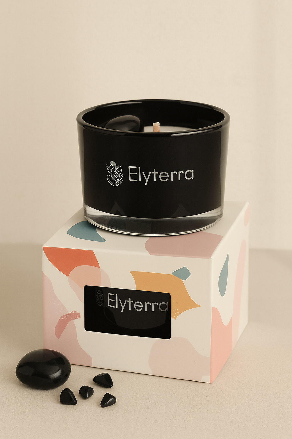 Bougie Elyterra – Alliance de cire naturelle et pierres énergétiques pour une ambiance zen et parfumée. Idéale pour la relaxation et la décoration.